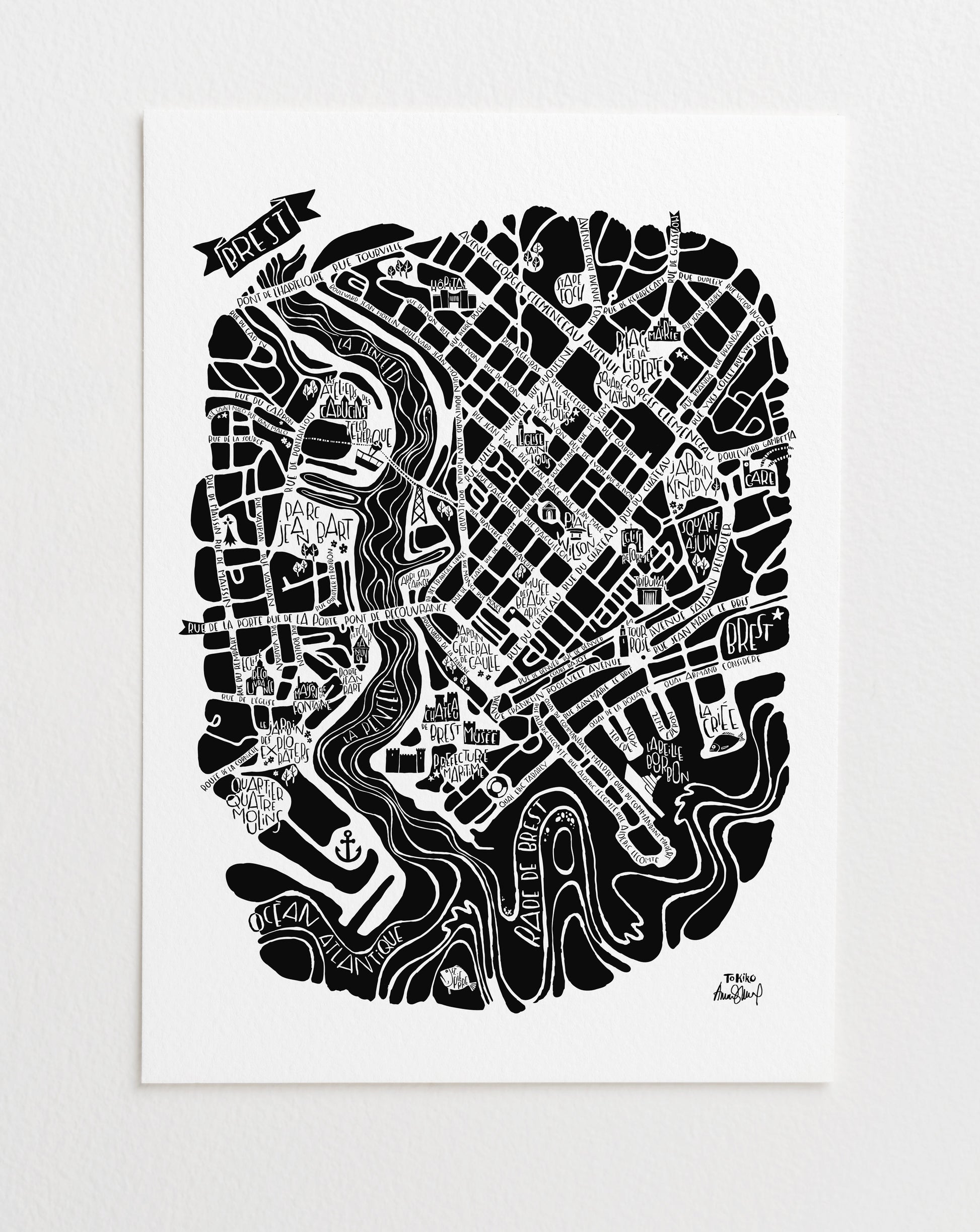 Tout d’abord, cette illustration de Brest est imprimée à Bayonne sur un papier épais, artistique et haut de gamme. Avant tout issu de forêts gérées durablement. En effet, nous travaillons avec de l’encre à éco-solvant recyclable, et notre papier est labellisé ECF et certifié FSC.